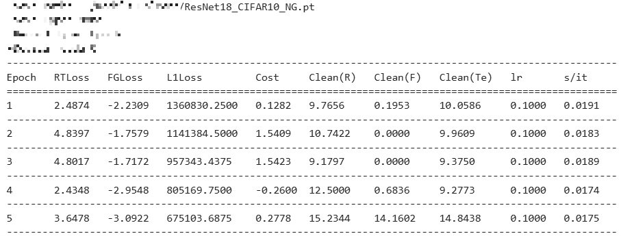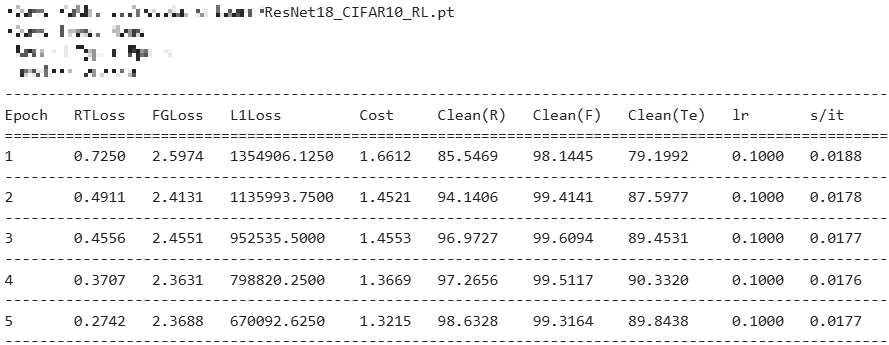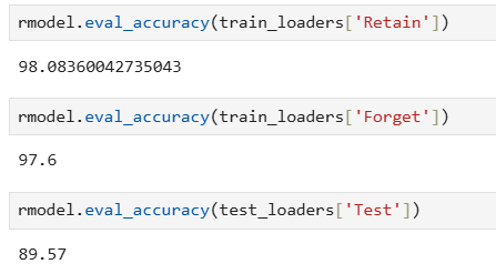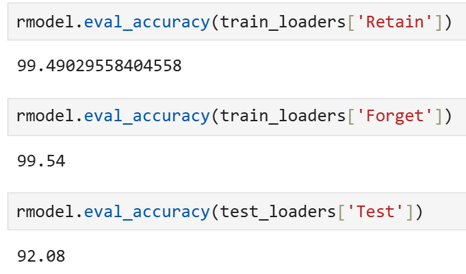 => 각각 Retain Accuracy, Forget Accuracy, Test Accuracy로 보존해야 할 데이터에 대한 분류 정확도, 삭제 요청 데이터에 대한 분류 정확도, 그리고 일반화를 위해 테스트 데이터셋에 대한 분류 정확도이다.
